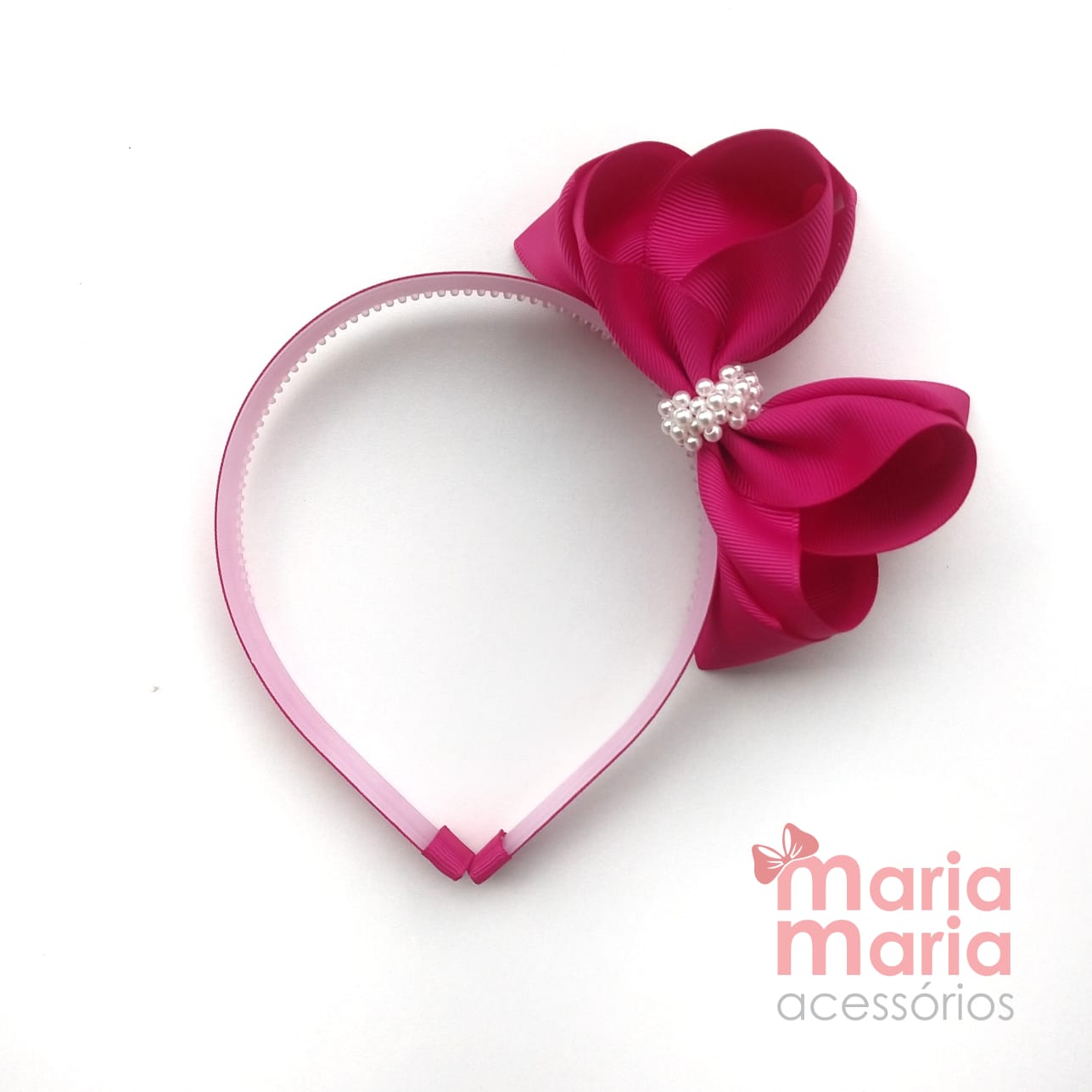 Tiara flexível, com dentes e encapada com fita de gorgurão; laço em fita de gorgurão e acabamento do meio com pérolas brancas bordadas.